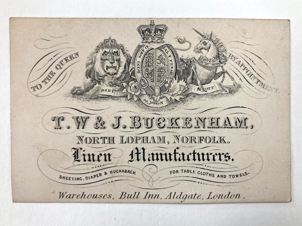 The villages of North and South Lopham were a centre for linen weaving during the eighteenth and nineteenth centuries. The firm of T. W. & J. Buckenham acquired the Royal Warrant as suppliers of Diaper and Huckaback Table Cloths to Queen Victoria in 1837. The industry survived until 1925 by manufacturing high-quality linen for prestigious clients including the Royal Household, City Livery Companies and aristocracy. Material evidence of this lost industrial tradition survives in the form of woven linen and equipment in the collection of Norfolk Museums Service. 1
