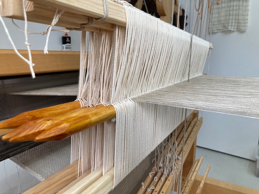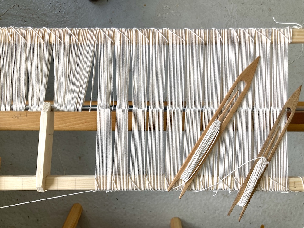 4. I used NM 20/6 cotton warp yarn, having first tried 20/9 and finding it too heavy, causing congestion between heddles and warp. ↩︎