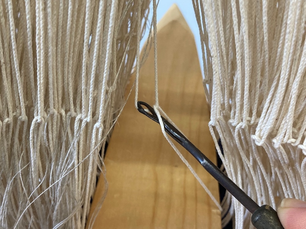 Using a latched threading hook to thread warp yarn through clasped heddle. ©Max Mosscrop