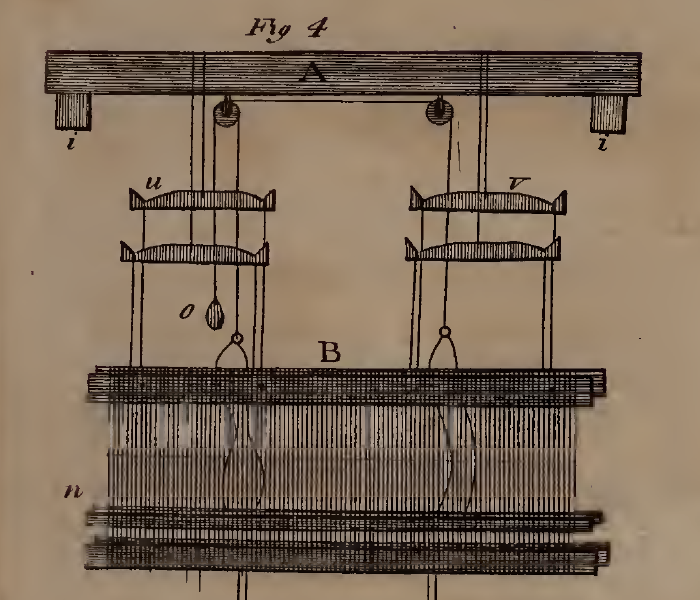 Detail of illustration in Murphy. J. (1827) Treatise on the Art of Weaving, showing the mechanism for slackening the heddles, rods (n) raised by by pulling down handle (o).