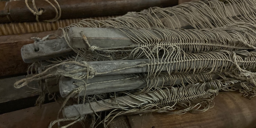 Before the introduction of mass-produced wire or polyester heddles, handweavers used string heddles tailor-made by the weavers or professional heddle makers. The reed, heddles and shafts were collectively referred to as ‘gear’. The survival of such gear – both fragile and easily lost – is rare.
